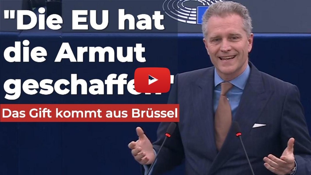 „Takže EU chce teď bojovat proti chudobě. Přitom ji sama vytvořila. Nejlépe je to vidět na Německu. Dříve bohatá, průmyslově silná země si nyní musela nově půjčit sto sedm miliard eur, aby mohla uskutečnit agendu, která přichází z Bruselu. Jed přichází z Bruselu. Podívejte se, za co jsme ty peníze utratili. Padesát miliard na migraci, dalších šestnáct miliard náklady na odstavení jaderné energie, podpora EEG osmnáct miliard a podpora elektromobility. To všechno jsou zelené sny, které opět přišly z Bruselu, a dalších patnáct miliard na Ukrajinu.